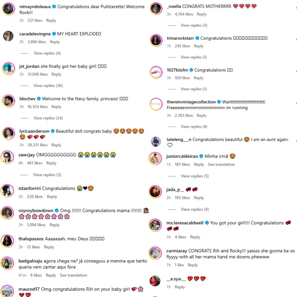 The second slide of the post featured tiny pink boxing gloves. According to reports, the symbolism lies in Rocki being named after her father, whose real name is Rakim Mayers. Since his nickname is Rocky, the boxing gloves are most likely a nod to the legendary fictional boxer Rocky Balboa from the “Rocky” film franchise. As for her middle name, Irish, it is thought to be a tribute to the “Smurf” star’s late father, Ronald Fenty, who was of African, Irish, English and Scottish descent.