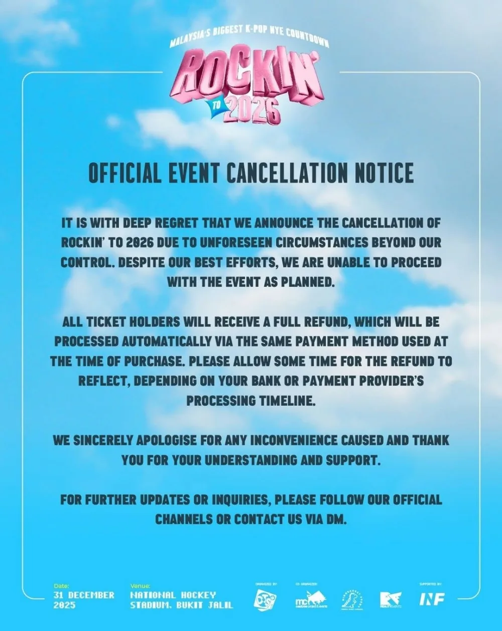 The official Rockin’ To 2026 Instagram page later shared the news, citing “unforeseen circumstances” as the reason for the cancellation. “Despite our best efforts, we are unable to proceed with the event as planned. We sincerely apologise for any inconvenience caused and thank you for your understanding and support,” the statement read. Fans who have purchased tickets will receive a full refund.