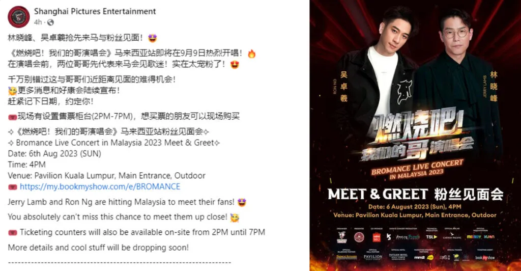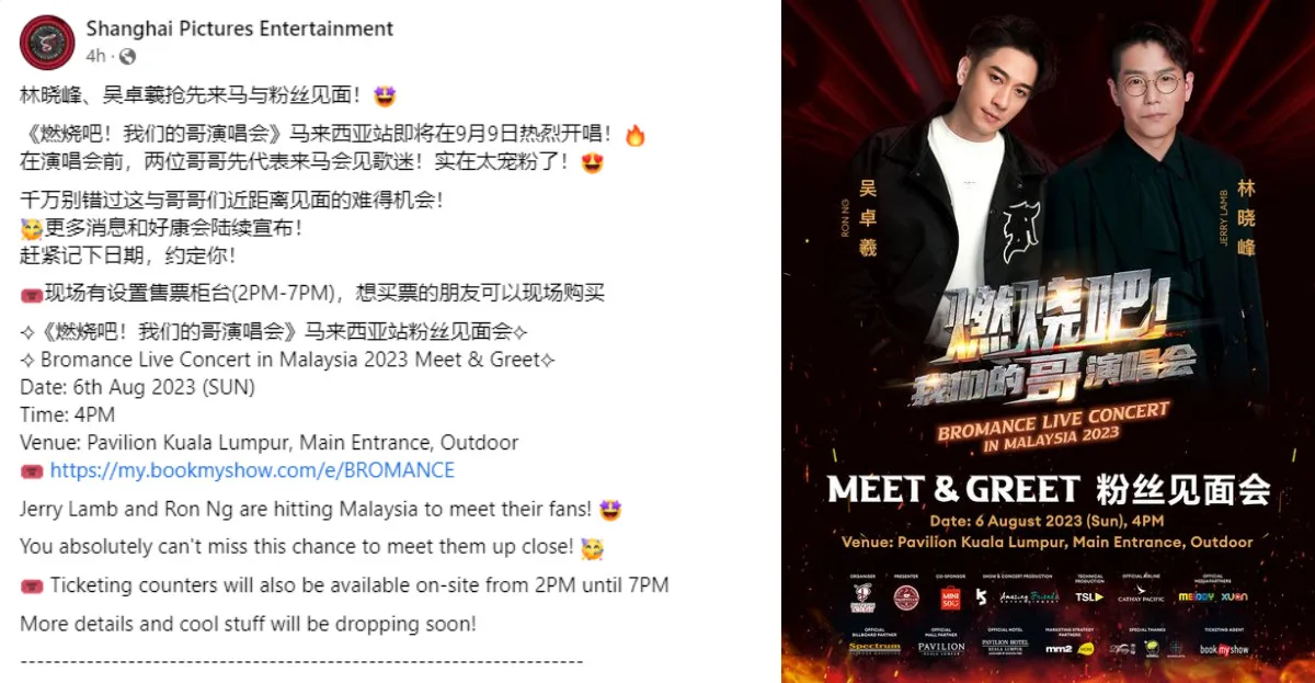 Ron Ng and Jerry Lamb will also be performing in “燃烧吧!我们的哥演唱会 (Bromance Live Concert)” in Malaysia in September. Tickets have already been sold, but it seems Ron and Jerry simply can’t wait to meet their fans as they will be holding a meet-and-greet in Pavilion KL first!