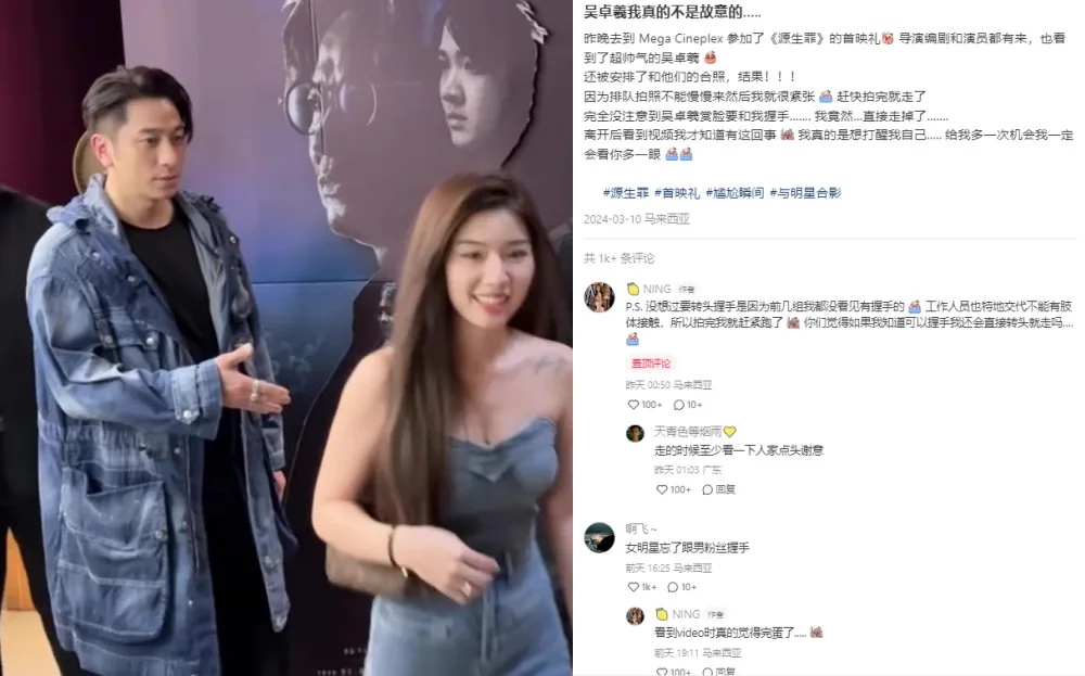 The fan herself has since uploaded the video to Xiao Hong Shu (小红书), apologising for the incident. “Because I couldn’t take my time (as there were others) queuing up to take photos (with him), I was very nervous and left hurriedly after taking the photo,” she explained. “I didn’t even notice that Ron Ng wanted to shake hands with me.”