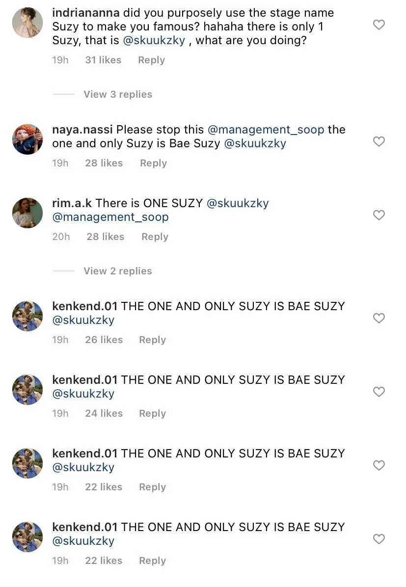 Many fans of Bae Suzy were not thrilled when they heard about the rookie idol, mainly because of the former miss A member’s mega-star status. As a result, many began flooding the comments section on the latter’s personal IG with hateful comments towards her. While some accused her of “intentionally using the stage name to become famous“, others claimed that “there’s only one Suzy”.