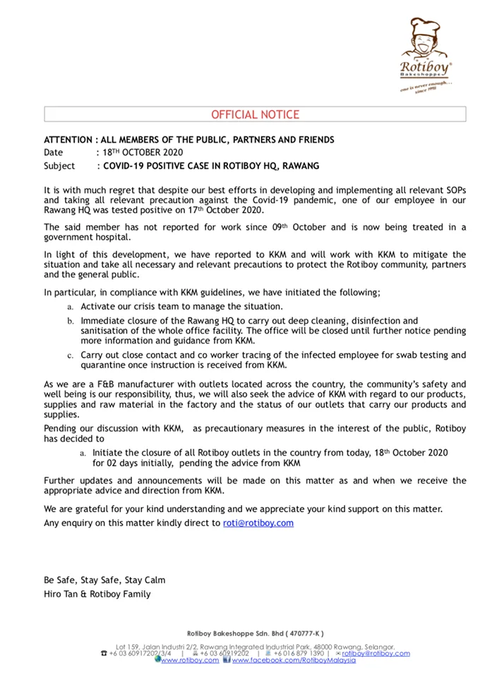 - Immediate closure of Rotiboy Malaysia’s headquarters in Rawang to carry out deep cleaning, disinfection and sanitisation.