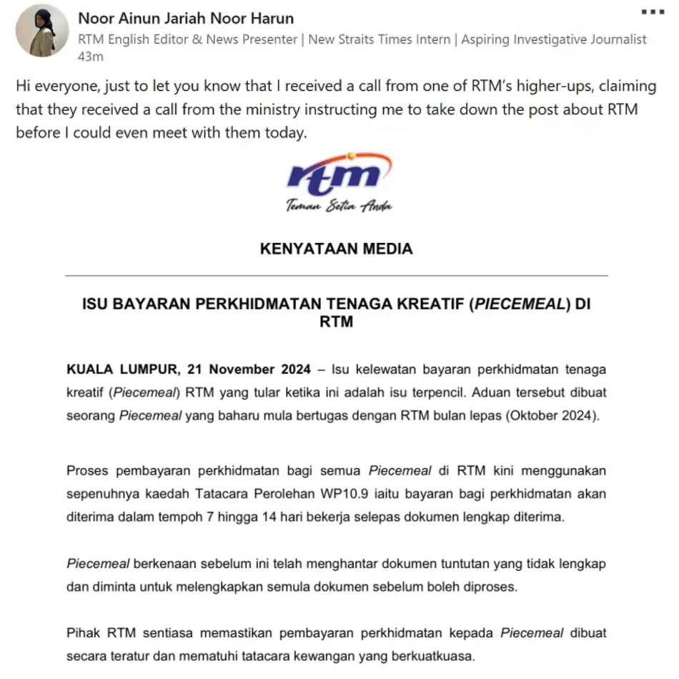 After Noor Ainun’s story went viral, she was contacted by RTM and asked to remove the post. In addition to her update, RTM issued an official statement to address the situation. The company claimed that the employee had submitted incomplete documents, which allegedly resulted in her salary not being processed on time. However, Noor Ainun argued that this was not the case.