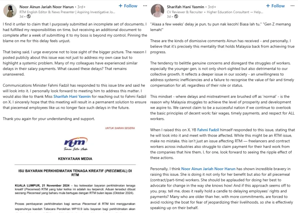 “While this might be an RTM issue, make no mistake, this isn’t just an issue affecting RTM — freelancers and contract workers across industries also struggle to claim payment for their hard work from the companies that hire them. I, for one, look forward to seeing the ripple effect of these actions. To the higher-ups, please show some empathy,” she wrote on her page. Both women stated that Communications Minister Fahmi Fadzil had responded to their calls and would look into the issue.