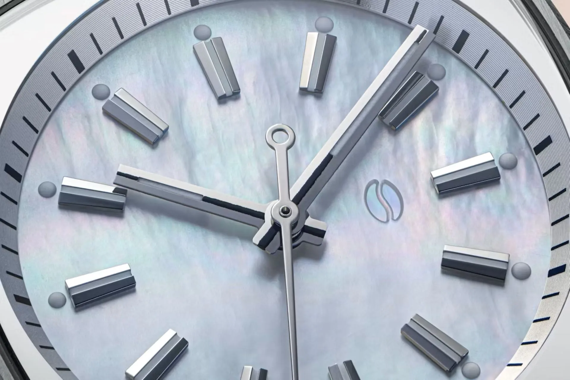 Despite its small size, the Metric Lite still offers plenty of visual interest. The dial features polished indices shaped like tiny mountain peaks, a deep-set rehaut, and soft-glowing lume dots.