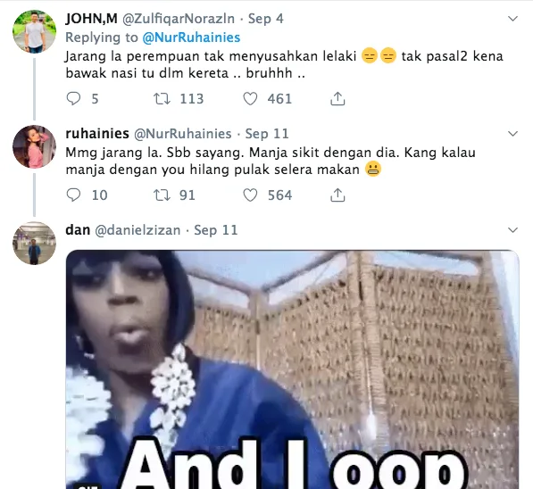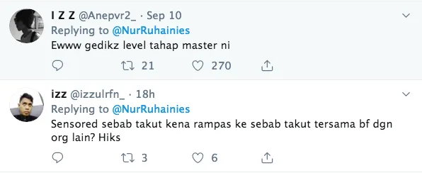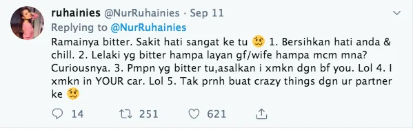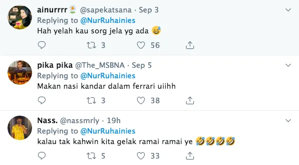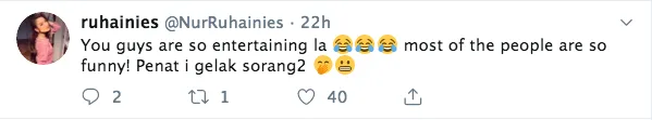 Ruhainies updated her fans with another tweet to address the issue. In the tweet, she gave out a list of clarification to all the “bitter” netizens out there, “First of all, chill out and clean up your hearts. Secondly, to all the bitter guys: How do you treat your girlfriends as well as your wives? Thirdly, to all the bitter girls: I don’t even eat with your boyfriend. LOL.”