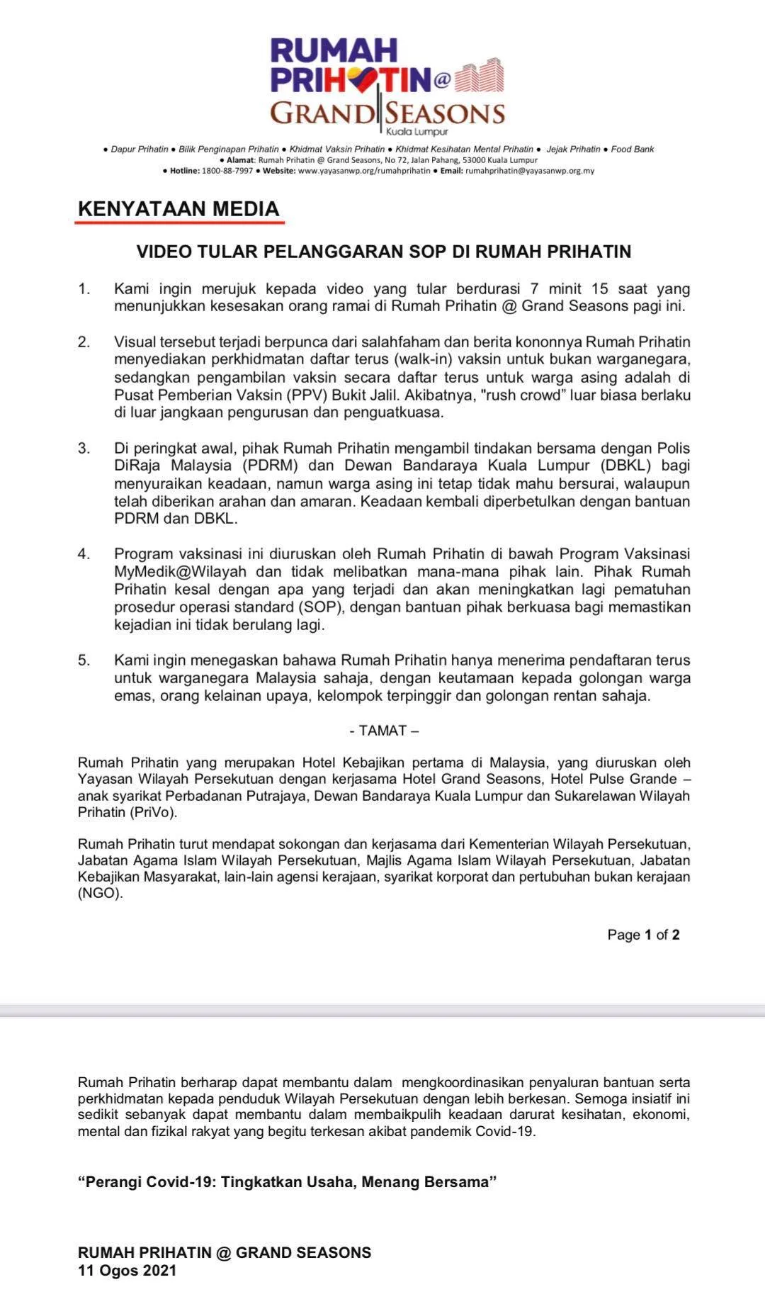 Following the release of the video, Rumah Prihatin @ The Grand Seasons Hotel, issued a statement detailing that the video was filled with misinformation. Apparently, Rumah Prihatin only executes walk-in vaccinations for citizens of Malaysia and not for non-citizens, whose vaccinations are handled at PPV Bukit Jalil! The statement also mentioned that an unusual “rush crowd” occurred.