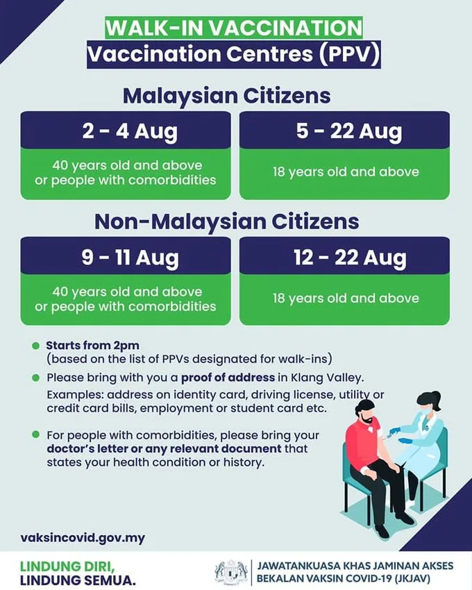 Therefore, National Covid-19 Immunisation Programme Coordinating Minister Khairy Jamaluddin has implemented walk-in vaccination centres (PPVs) throughout the vaccination program beginning 2nd August. According to the timeline of the walk-in PPVs, vaccinations for Malaysians would be from 2nd to 4th August for individuals aged 40 and above or people with comorbidities. Individuals aged 18 and above would be able to get their vaccines in another slot from 5th to 22nd August.