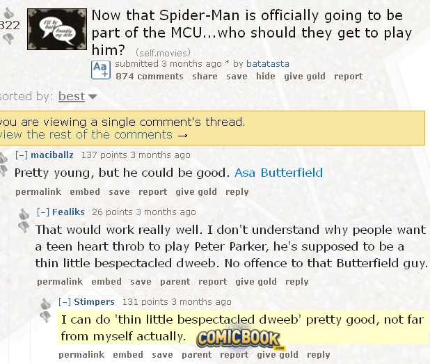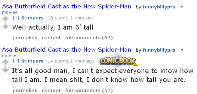The “Hugo” star created the verified screename, “Stimpers”, for an AMA session he did on Reddit a few years ago. After news broke that he was the frontrunner for the part as Spider-Man, a link to that story was posted on Reddit. The actor himself chimed into the discussion and made 2 comments before deleting them.