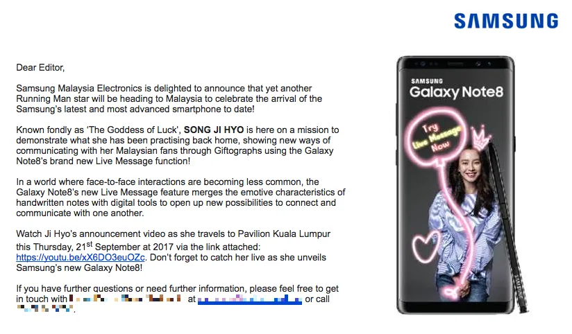 The actress will be travelling to Pavilion Kuala Lumpur on 21st September (Thursday) to welcome the new Samsung Galaxy Note8 from 10am till 1pm.