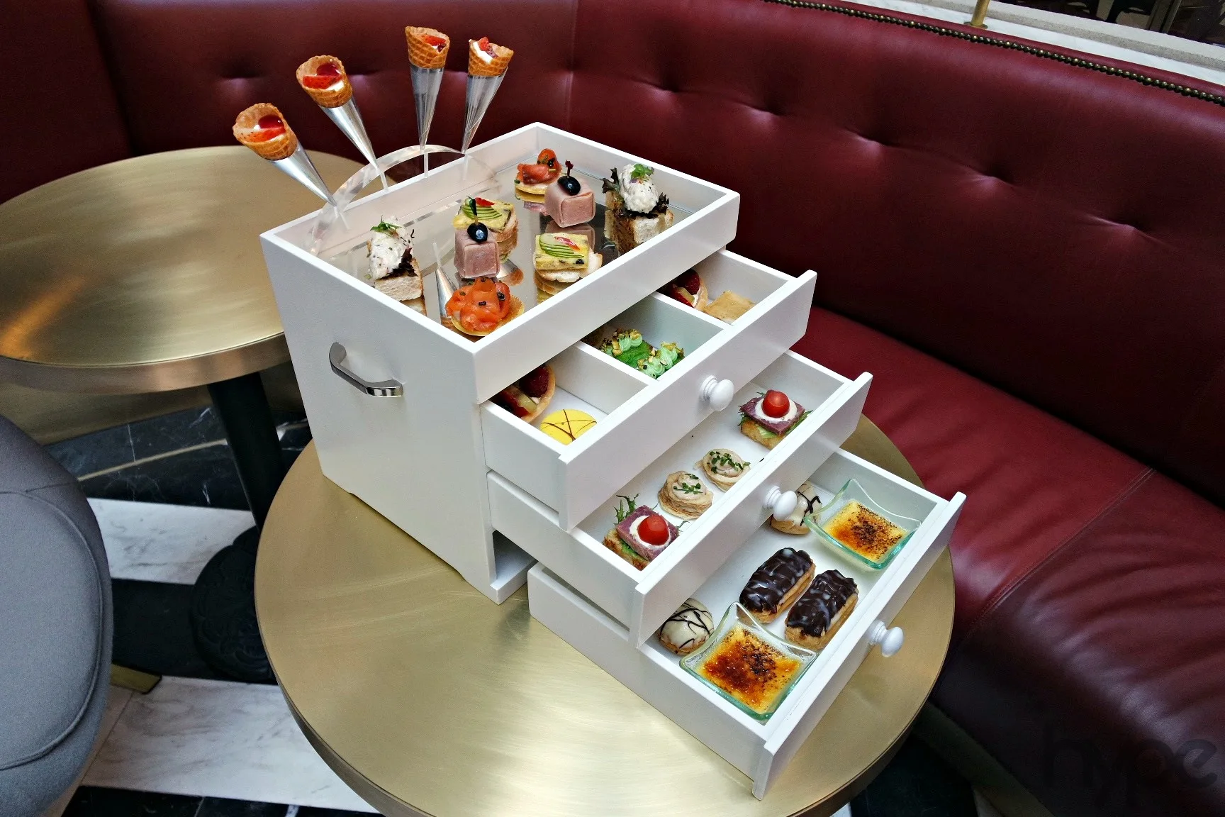 That’s not all, Cafés Richard’s Parisian High Tea Set (RM143 for 2, served from 2:30pm to 5:30pm) is a treasure “cabinet” filled with both savoury and sweet treats including Blini with smoked salmon and chive dressing, cheese cakes, and crème brûlée. We’re not too fond of the savoury snacks but we enjoyed eating the desserts, especially the mini chocolate éclairs. Yum!
