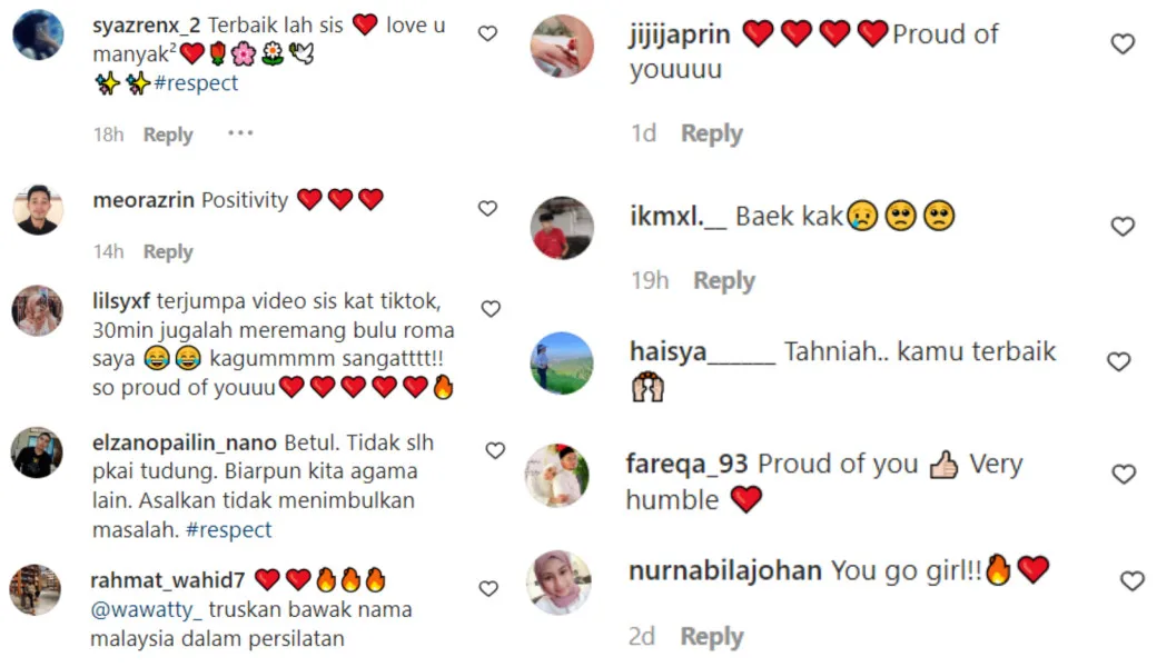 Netizens also left supportive comments on her post. “You are the best,” “You are right. It’s not wrong to wear a head scarf,” “Keep making Malaysia proud,” and “Positivity (heart emojis),” they wrote.