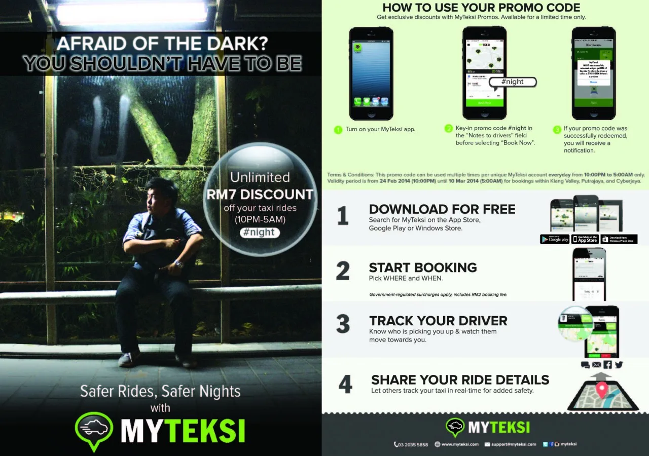 As part of the Afraid of the Dark campaign, MyTeksi is giving its users a RM7 discount for late night bookings from February 24th till March 9th 20014. All you have to do to be entitled for the discount is key in #night into the “Notes to Driver” field for pick-up times between 10.00pm to 5.00am.