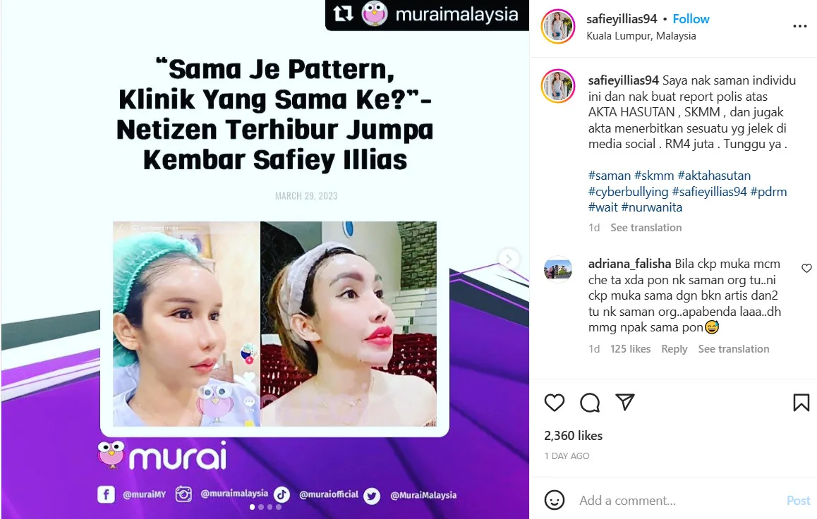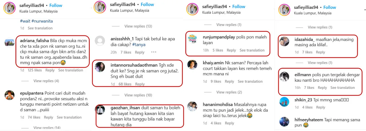 Safiey, on the other hand, was not having it with the netizen’s comparison. “I want to sue this individual and make a police report for (breaching the) Sedition Act, the MCMC (Malaysian Communication and Multimedia Commission) and also for coming up with a nasty post on social media. RM4million. Just you wait,” the “Apa Itu Syinta” wrote on IG.