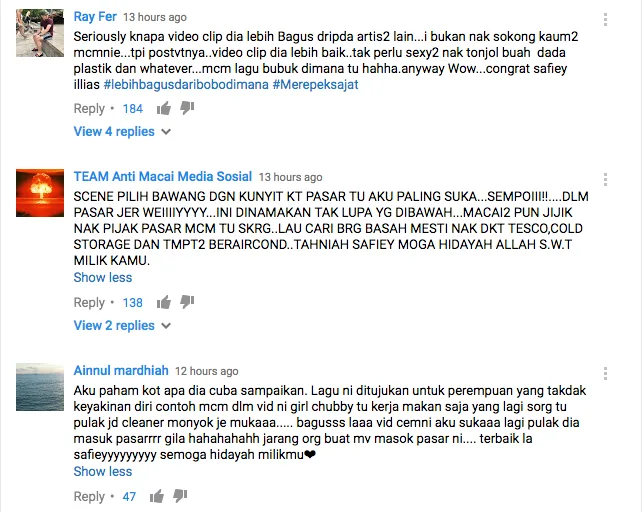 Netizens also complimented Safiey for appearing modestly and looking classy throughout the whole video, and many especially like the scene when she bought turmeric (kunyit) and onions (bawang) at the market.