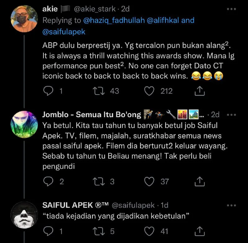 A Twitter user also mentioned how prestigious the award was before with another one agreeing to them. “Back then, ABP was prestigious. Even the nominations were big names. It (was) always a thrill watching this (award) show. Even the performances were interesting. No one can forget Dato CT iconic back to back to back to back wins“; “Yes, that’s right. we know that year there were so many job (opportunities) for Saiful Apek. His films were always shown in the cinema. That’s why he won the award that year! No need for buying voters“, agreed the other one.