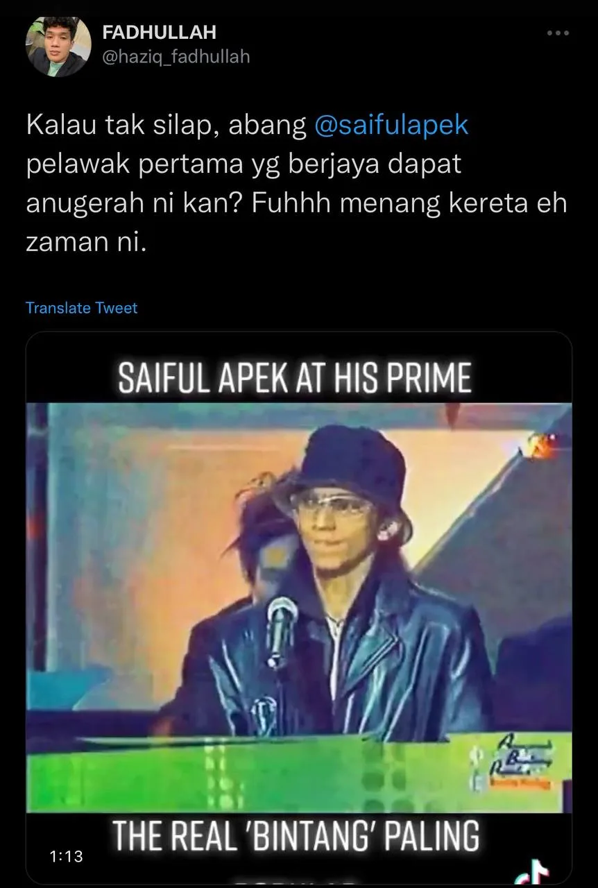A Twitter user named @haziq_fadhullah reposted a TikTok of Saiful Apek winning the award from 2003 and wrote, “If I’m not mistaken, @saifulapek is the first comedian to succeed in bagging the award, right? Fuhhh, he won a car back then.” Along with that, a user replied to the tweet saying how back then, ABPBH was a prestigious award, and everyone who won, actually deserved it; to which Saiful Apek replied with what started a discussion in the reply section, “that’s the difference between artists and artistic souls.”