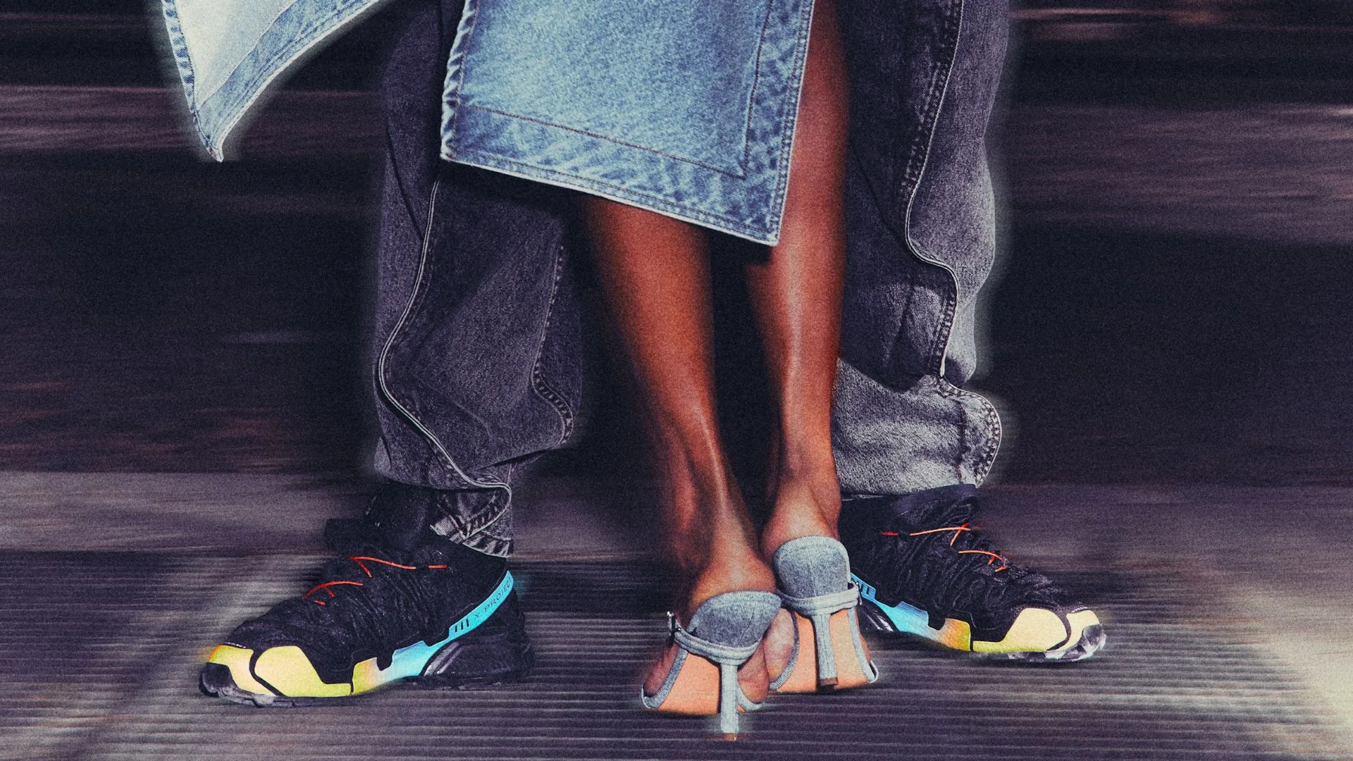 The scrunched fabric texture is achieved using an adjustable drawstring to hold the drape in place, creating a pleated aesthetic that reveals the iconic Sensifit™ technology underneath. This intricate fabric work adds to the shoe’s striking visual appeal, balancing luxury with functionality.