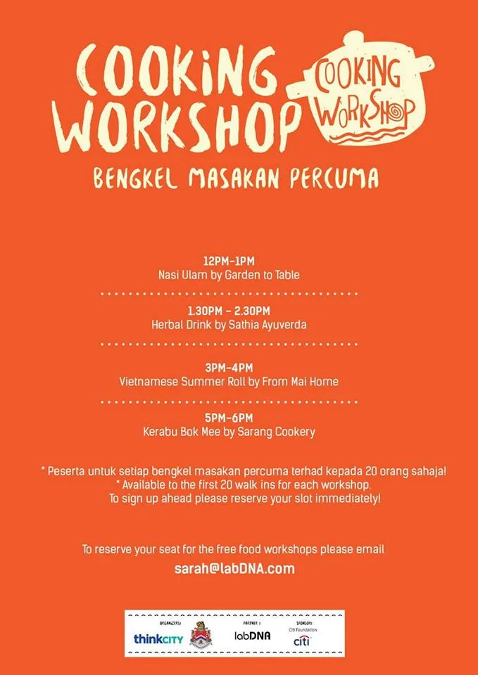 Aside from the batik-making workshop (which requires a RM15 fee), all other workshops are free of charge. To reserve a spot, email sarah@labDNA.com for the cooking workshop, mgmt@akhyla.com for the music production workshop, and sharina@everydaystudios.net for the art jam.