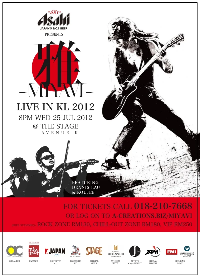 Asahi (Japan’s No. 1 Beer) is proud to present the larger than life Japanese rock musician Miyavi live exclusively at The Stage in Avenue K, Kuala Lumpur on 25th July 2012 (Wednesday) at 8pm.