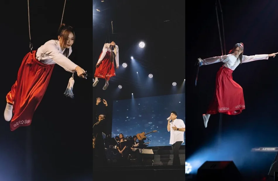 Who says beauty queens only know how to look pretty on stage? Definitely not Sandra Lim. Showcasing her martial arts skills and knowledge, the young artist once performed in a Chinese orchestra theatre show alongside singer Lenny Ooi (阿水黄得伟). As seen in the photos above, Sandra was suspended in the air with a prop sword in her hand, further proving that she was not afraid to do her own stunts.