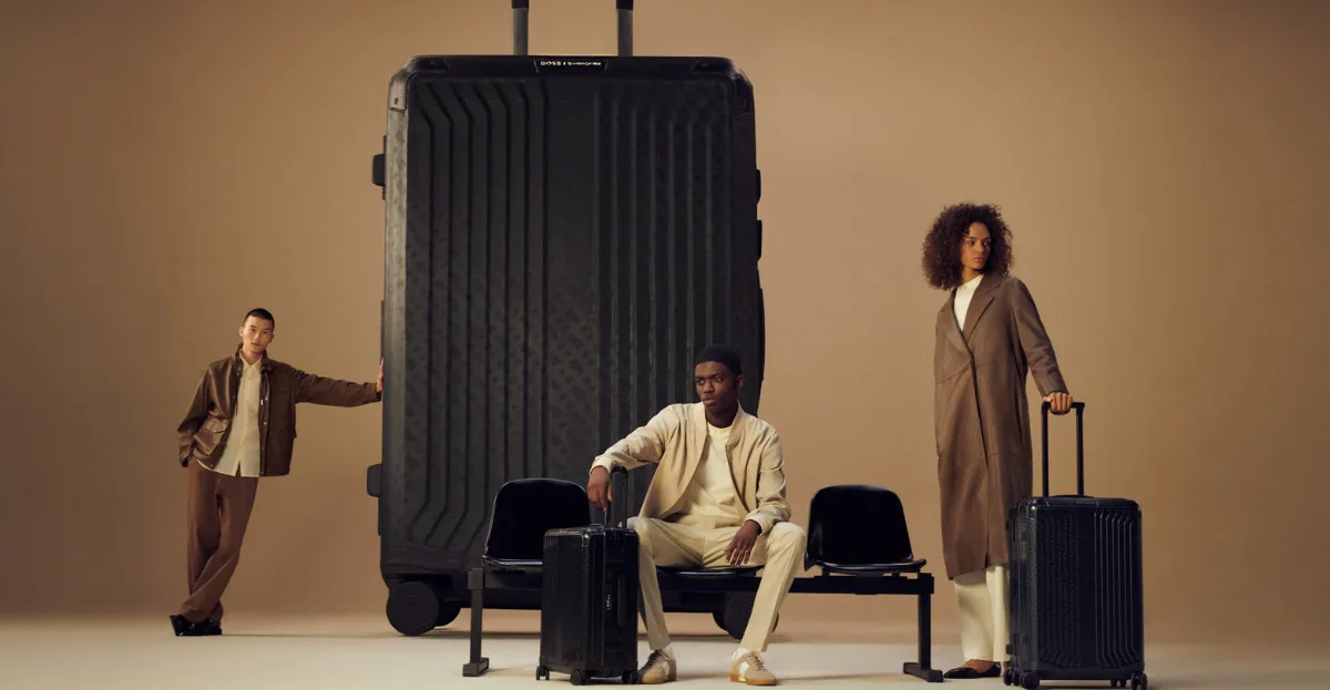 BOSS and Samsonite launch “Departures,” a campaign unveiling their joint capsule luggage line. Picture this: chic travellers stepping into an oversized suitcase, symbolising endless exploration. Crafted from premium aluminium, these sleek suitcases boast the iconic BOSS monogram and co-branded leather handles for a touch of luxury.