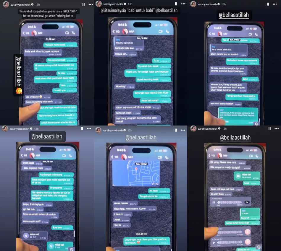 Taking to her Instagram Story, the influencer posted several photos of the two alleged lovers’ text messages to each other after they were caught in the actress’s apartment unit together. The photos of the conversations were allegedly taken from Aliff’s phone as the texts were sent to someone with the initials NRF (believed to be Nur Ruhainies Farehah).