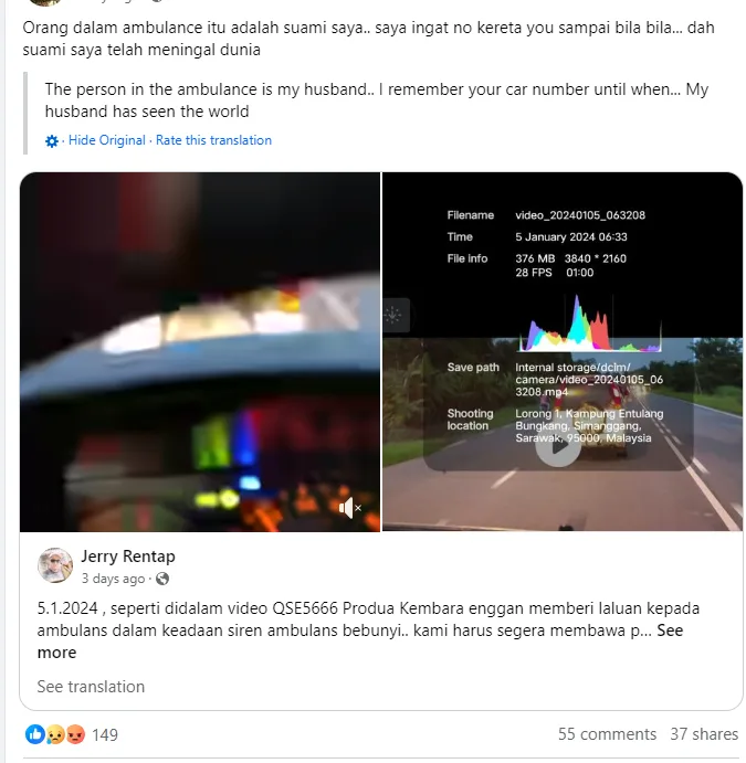 When we hear ambulance sirens, everyone knows its vital to make way for them as soon as possible. Unfortunately, this lady in Sarawak claims a car’s delay in moving aside for the ambulance carrying her husband, resulted in his passing.