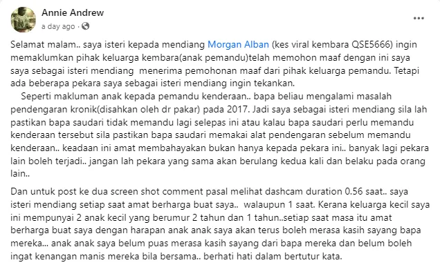 Annie publicly stated that she had accepted their apology, however, she urged the family to ensure that either their father did not drive anymore or to drive with hearing aids, in light of his hearing problem. “This condition is dangerous, and not only for the recent situation. A lot of other things can happen. Don’t let the same thing happen twice and to someone else,” she said.