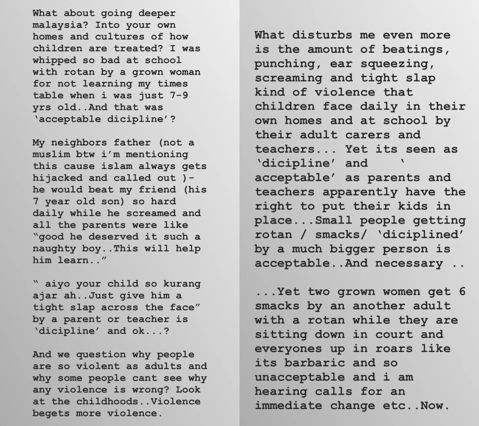 “What about going deeper, Malaysia? Into your own homes and cultures of how children are treated? I was whipped so bad at school with rotan by a grown woman for not learning my timetables when I was just 7-9 years old… And that was ‘acceptable discipline’?” Sarimah shared on her IG stories.