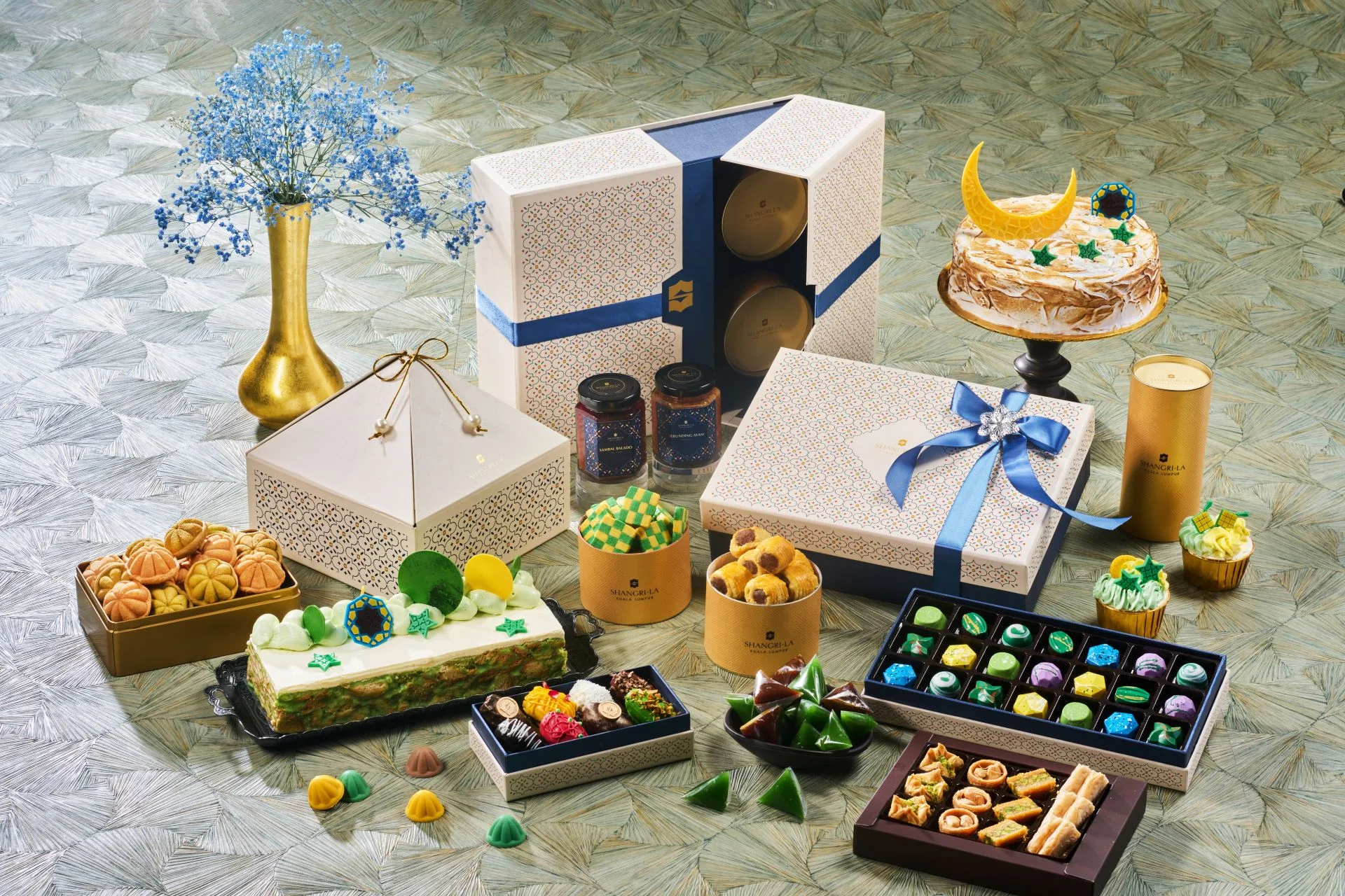 These elegantly-packaged hampers, cakes, and artisanal treats are perfect for gifting loved ones, colleagues, or business associates. Inspired by Malay artistry and Middle Eastern motifs, the packaging features royal blue and gold hues, symbolising serenity and prosperity.