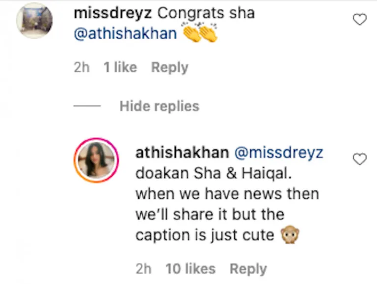 In addressing speculations, Athisha later clarified that she came up with that caption as it sounded “cute”. In replying to IG user @missdreyz she wrote, “Pray for both of us. When we have news then we’ll share it. But the caption is just cute. ?”
