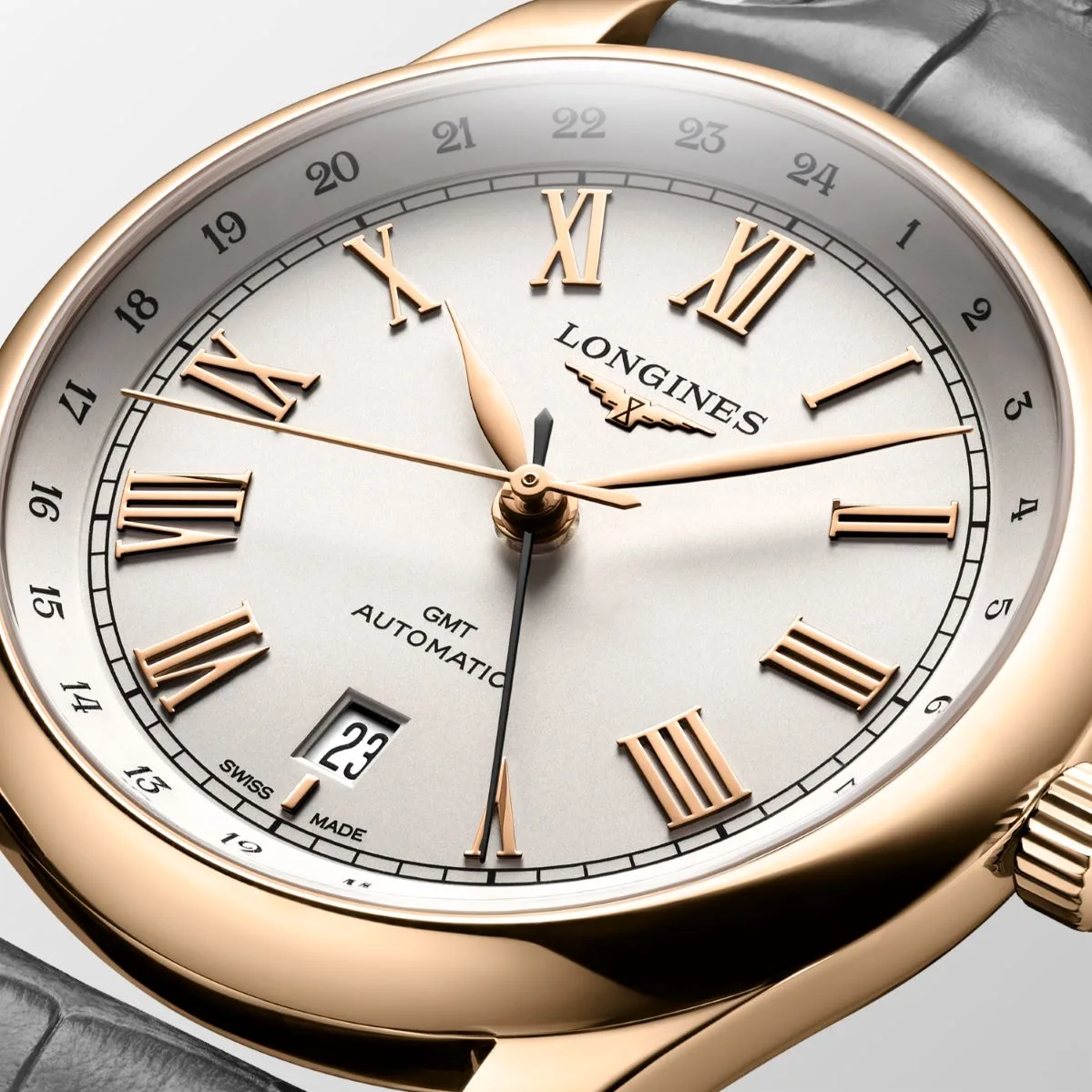 The Longines Master Collection GMT is distinguished aesthetically by its streamlined sophistication and the exceptional care taken over every detail. This attentiveness extends to the ultra-soft anthracite-grey leather strap,