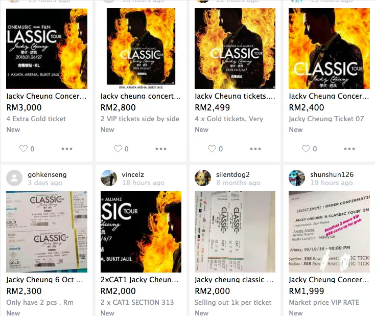 A quick look at Carousel and Viagogo Malaysia, and you’ll find scalpers making profit by reselling concert tickets at a much higher price. At Carousel, concert tickets range from RM650 to RM3000 per ticket. An original Gold class ticket costs RM988 but is now being sold at more than 3 times the price at RM3000.