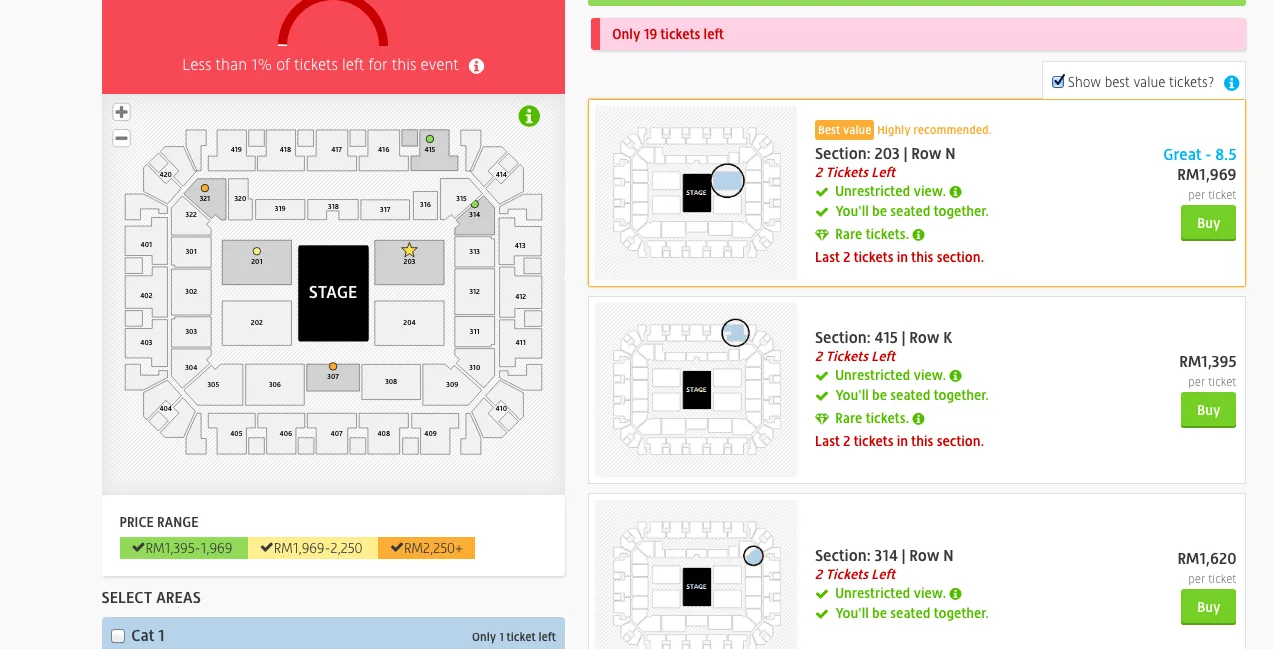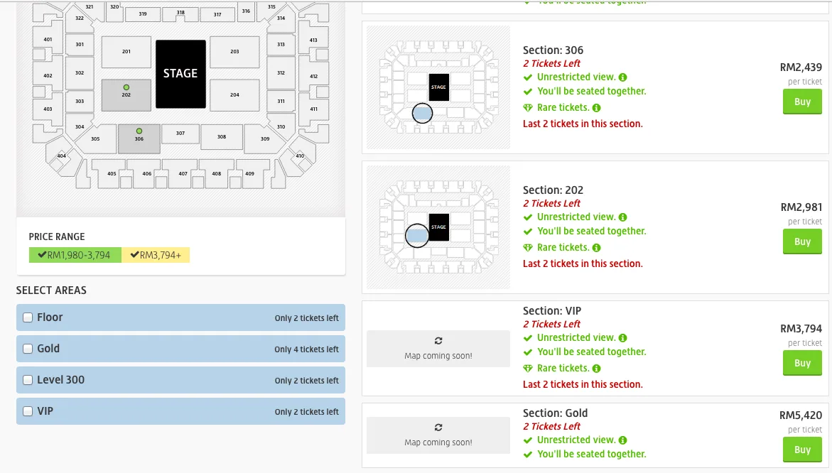 Meanwhile at Viagogo, a Gold class ticket is being sold at a ridiculous price of RM5420! A Cat 3 ticket, for example, which costs RM488 is being sold for RM1395. It’s the same case for other ticket categories.