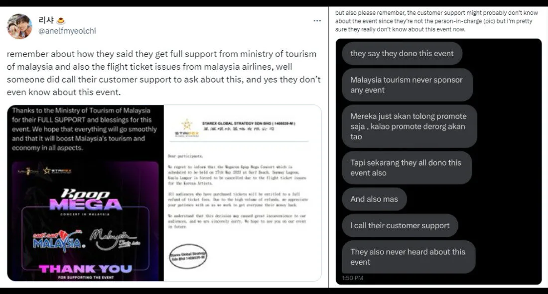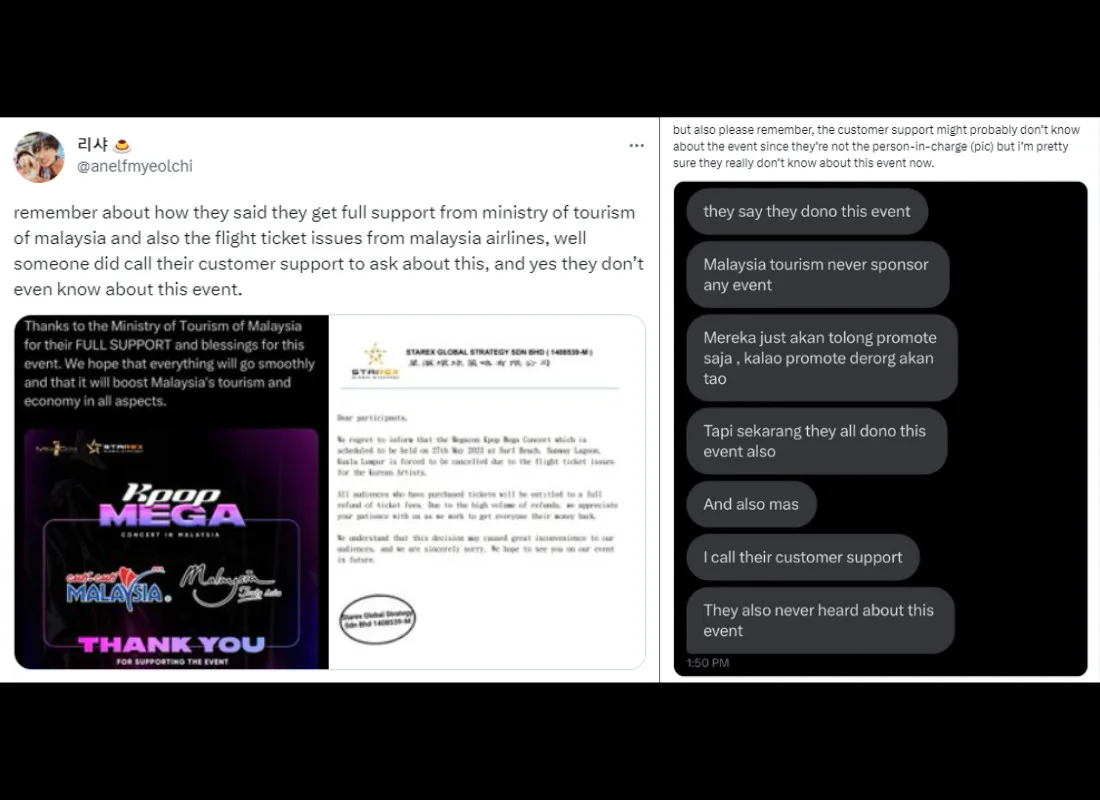 The same Twitter user had previously shared a reply from Starex Global clarifying the cancellation. According to Starex, the issue was due to a flight ticket mistake by Malaysia Airlines (MAS). However, @/anelfmyeochi also shared that, according to a MAS customer service officer, the airline was unaware of the event’s existence.