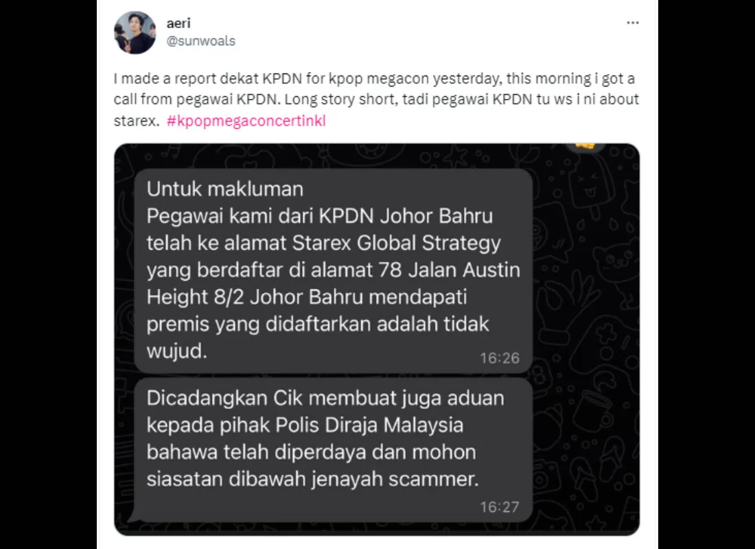 Twitter user @/sunwoals recently shared that after the concert’s cancellation, she made a report to the Ministry of Domestic Trade and Costs of Living (KPDN) regarding the concert and the organiser. The next day, she received a reply from an officer regarding Starex Global, saying that the business premise does not exist and urged her to report the company as a scam.