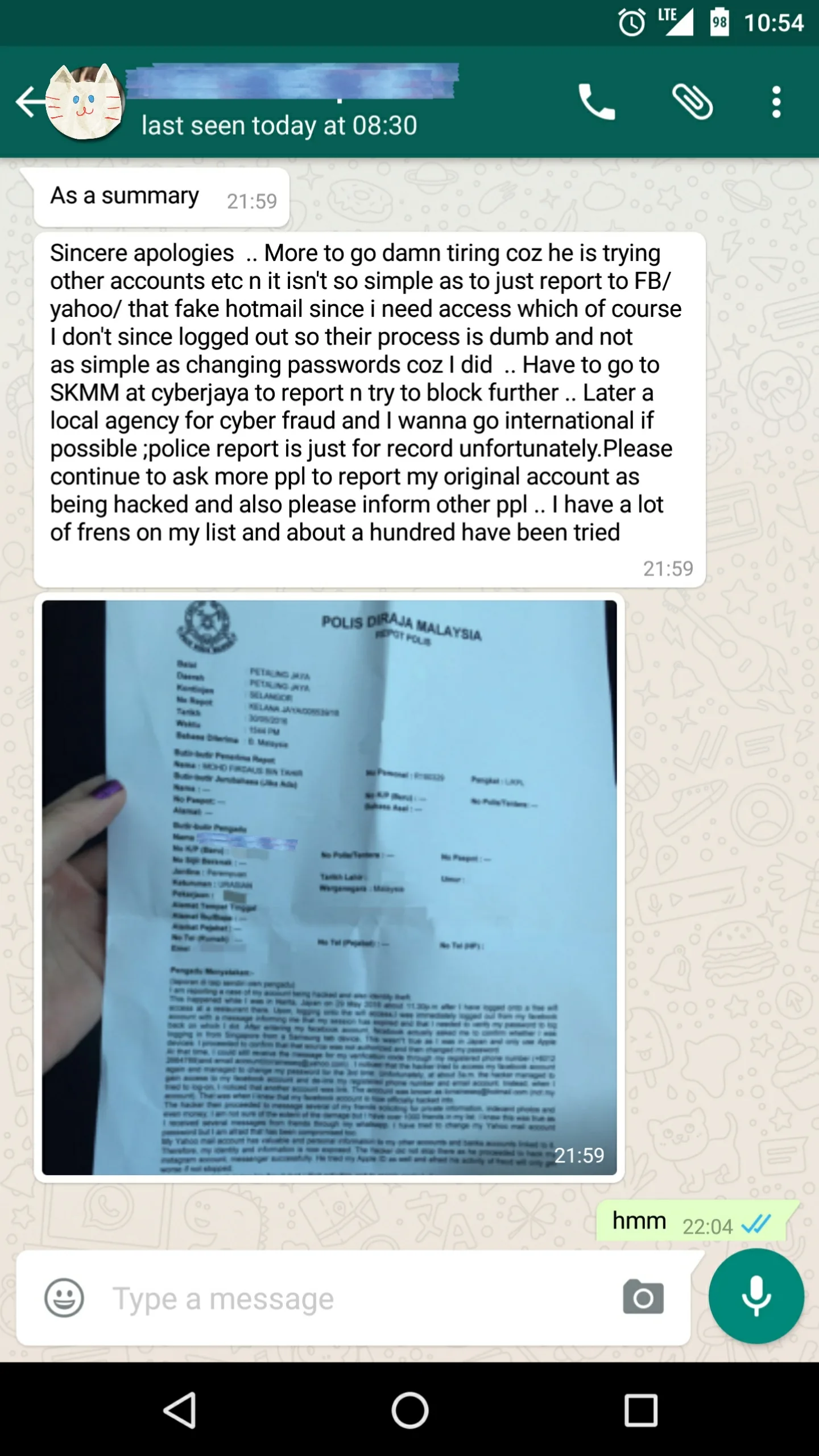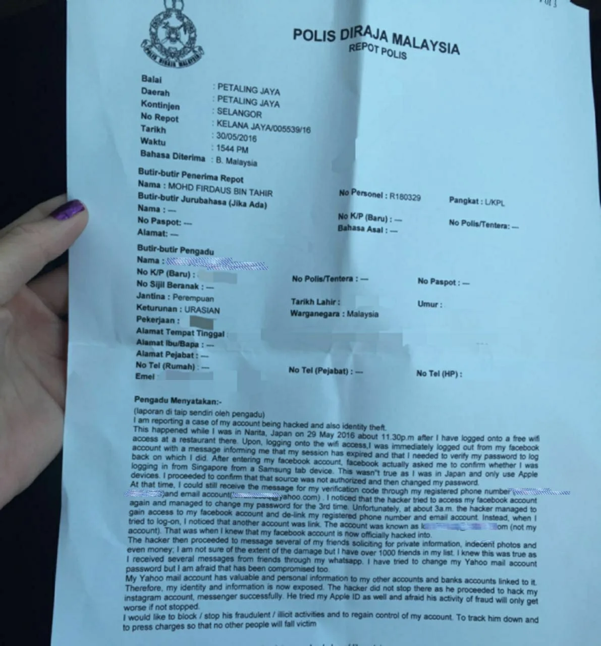 After going through what must have been a frustrating and nerve-wracking flight home, as soon as Anna returned to Kuala Lumpur, she went to a police station in Kelana Jaya, Selangor to file a report, before taking it up further with the Malaysian Communications And Multimedia Commission (MCMC) in Cyberjaya due to the severity of the case. As aforementioned, Anna’s personal information, banking, and other private details (phone operator, social media platforms) were compromised, effectively classifying her case as an identity theft.