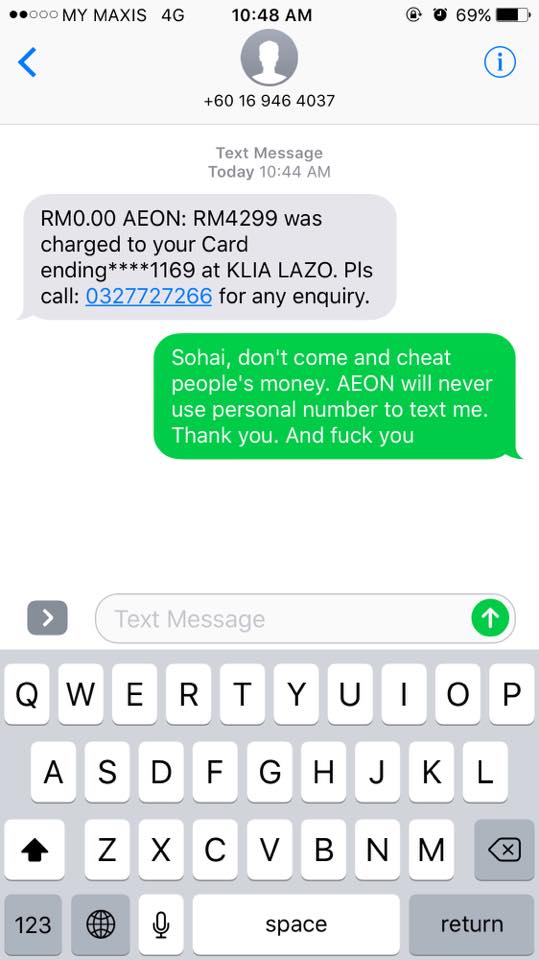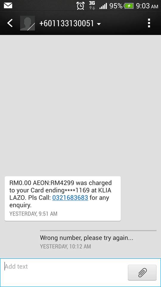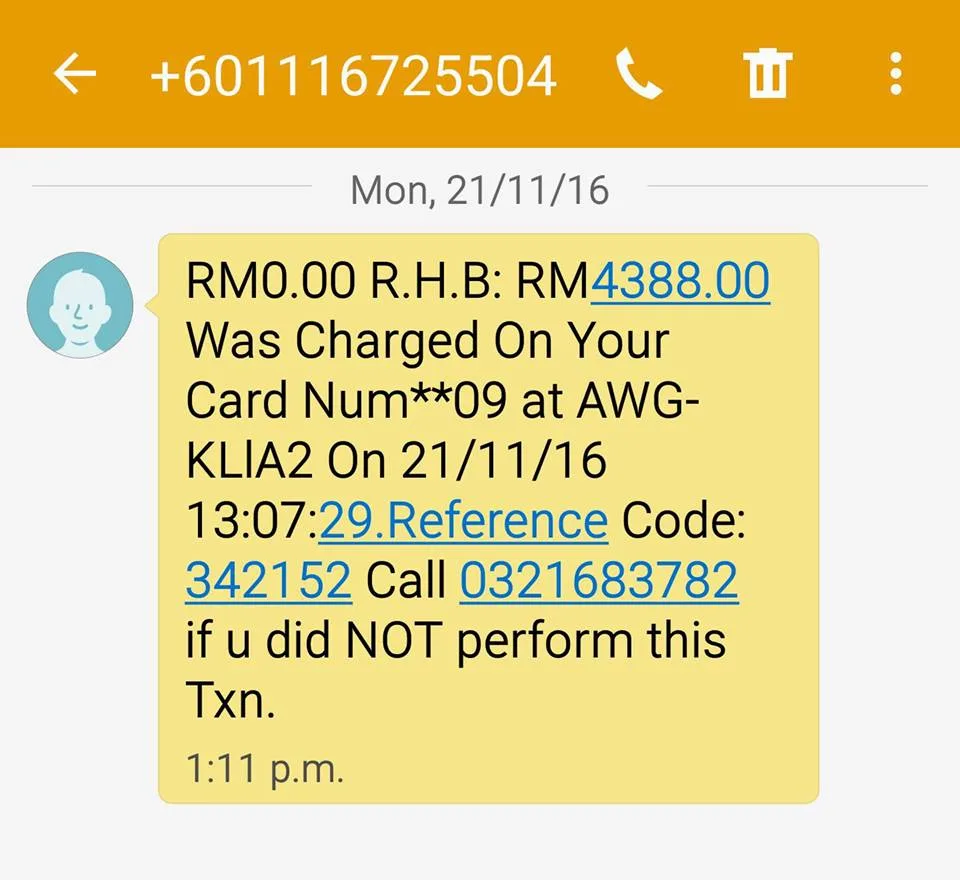 Another Facebook user known as Sunny Ng shared that he received a message saying that he made a transaction, amounting to RM4299, at KLIA. Other netizens also shared photos of scam messages they received recently and it all points to one similarity – the transactions were all made in KLIA or KLIA2.