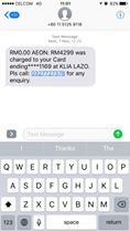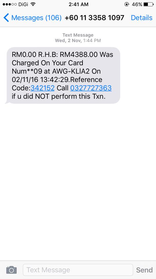 In her status, she wrote, “At 1:11pm today, I received an SMS from RHB bank claiming that I have a transaction from a premium watch shop in KLIA2. I have never owned an account with RHB, yet alone owning a CC (credit card). Obviously the amount displayed gave me quite a scare. I chose to ignore it but after a quick discussion with my colleagues, I decided to call the phone number displayed.”