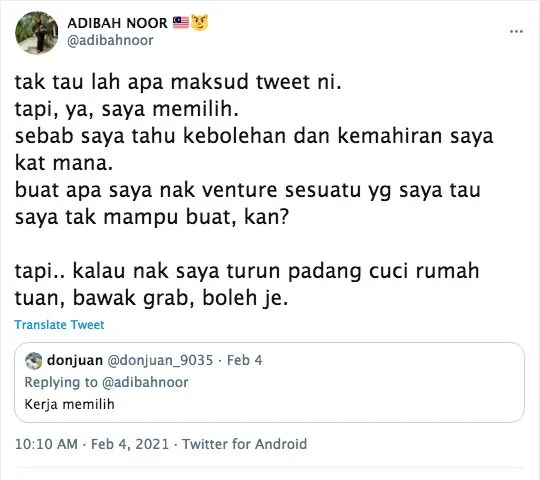 “I’m not really sure about the meaning of this tweet, but, yes, I am picky. This is because I am fully aware of my abilities and skills. Why would I want to venture into something that I’m not familiar with, right? But if you want me to come and clean your house, or even work as a rider for Grab, I’m on it,” Adibah clapped back at the netizen.