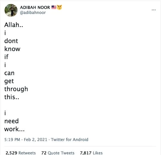 As for Adibah, the powerhouse songbird took to her Twitter expressing her concern over the lack of job offers. “God, I don’t know if I can get through this, I need work,” she tweeted. With over 2k retweets, many chimed in by providing suggestions for her to make a living during these tough times, including conducting tuition sessions online.