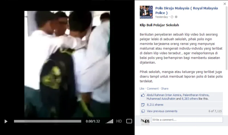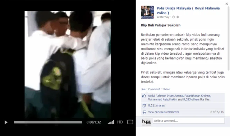After a one-minute-and-32-second long video showing some bullies repeatedly punching and throwing kicks at a school student in a classroom went viral, authorities stepped up to man the situation. The video was posted on the PDRM Facebook page, which later garnered thousands of shares.