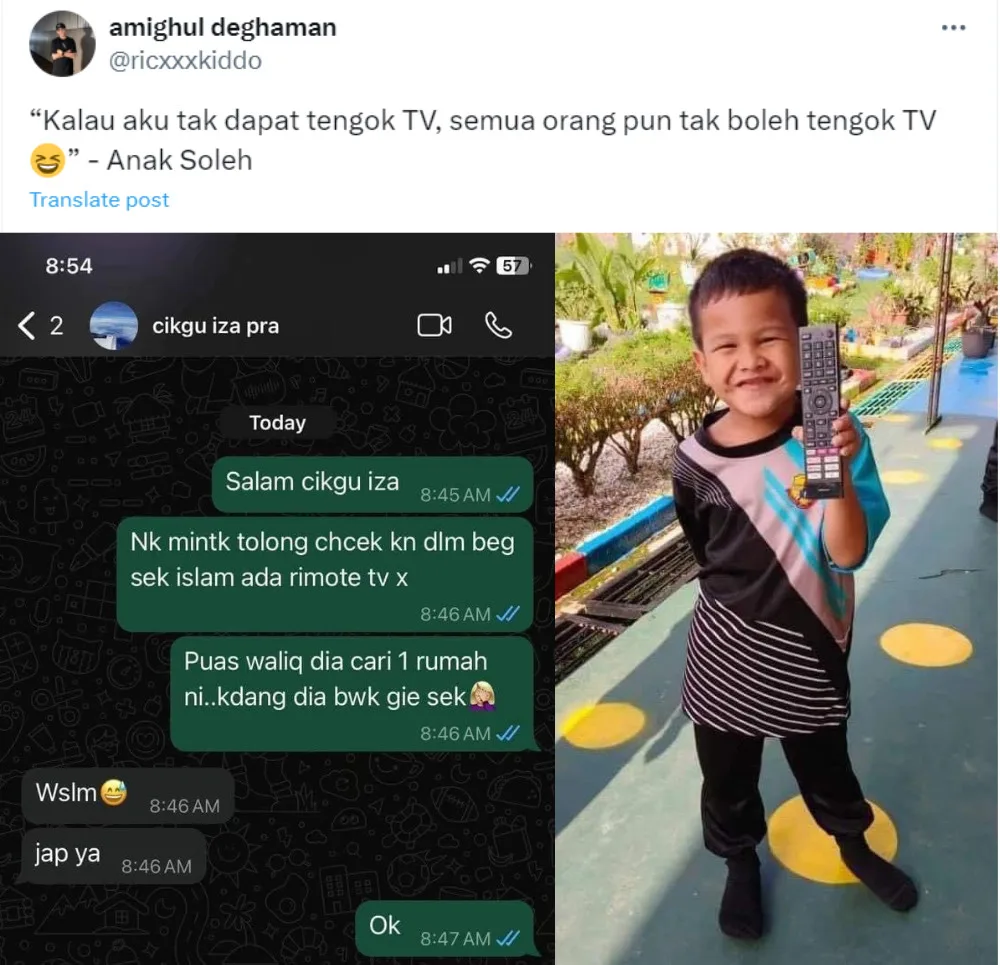 Twitter user @/ricxxxkiddo recently shared a WhatsApp conversation between a local mother and a school teacher. According to the screenshot, the mother had contacted the teacher, Iza, to check whether her son, Islam, had his home television remote control in his school bag. The mother followed up, saying the family had been searching the entire home for the remote, worried that the young boy might have taken it to school.