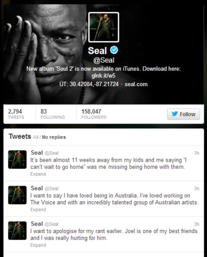 British singer Seal apologised Wednesday for a series of stinging tweets in which he said he “can’t wait to go home”, switching instead to profess his love for Australia.