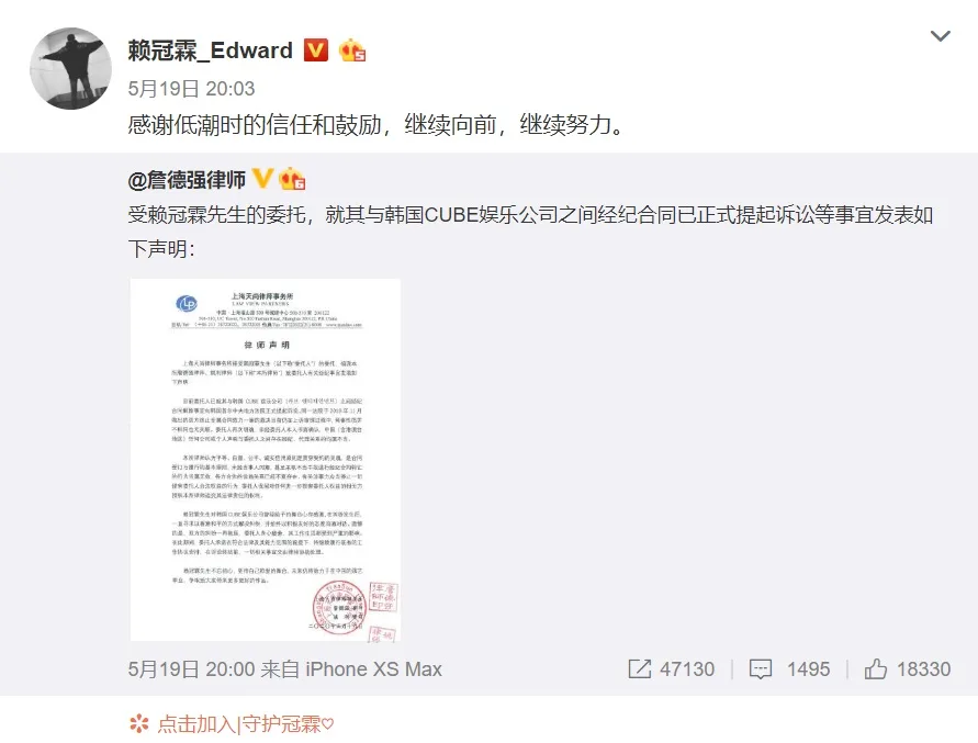 Kuanlin initially revealed that he will file a follow-up lawsuit against the entertainment company. He shared the news with his fans via his Weibo account earlier on Tuesday (19th May).
