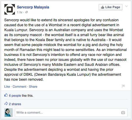 Servcorp, which used the same mascot in the digital advertisement in a promotional video in 2012, could not be contacted yesterday. But Servcorp Malaysia has since release a statement via its Facebook page to apologise for the misunderstanding. The international company explained that it wasn’t their intention to offend any race nor religion as they had no prior issues globally with the use of their mascot i.e. Middle East, Saudi Arabia. ServCorp Malaysia also clarified that the ad was earlier approved by DBKL but has now been removed.