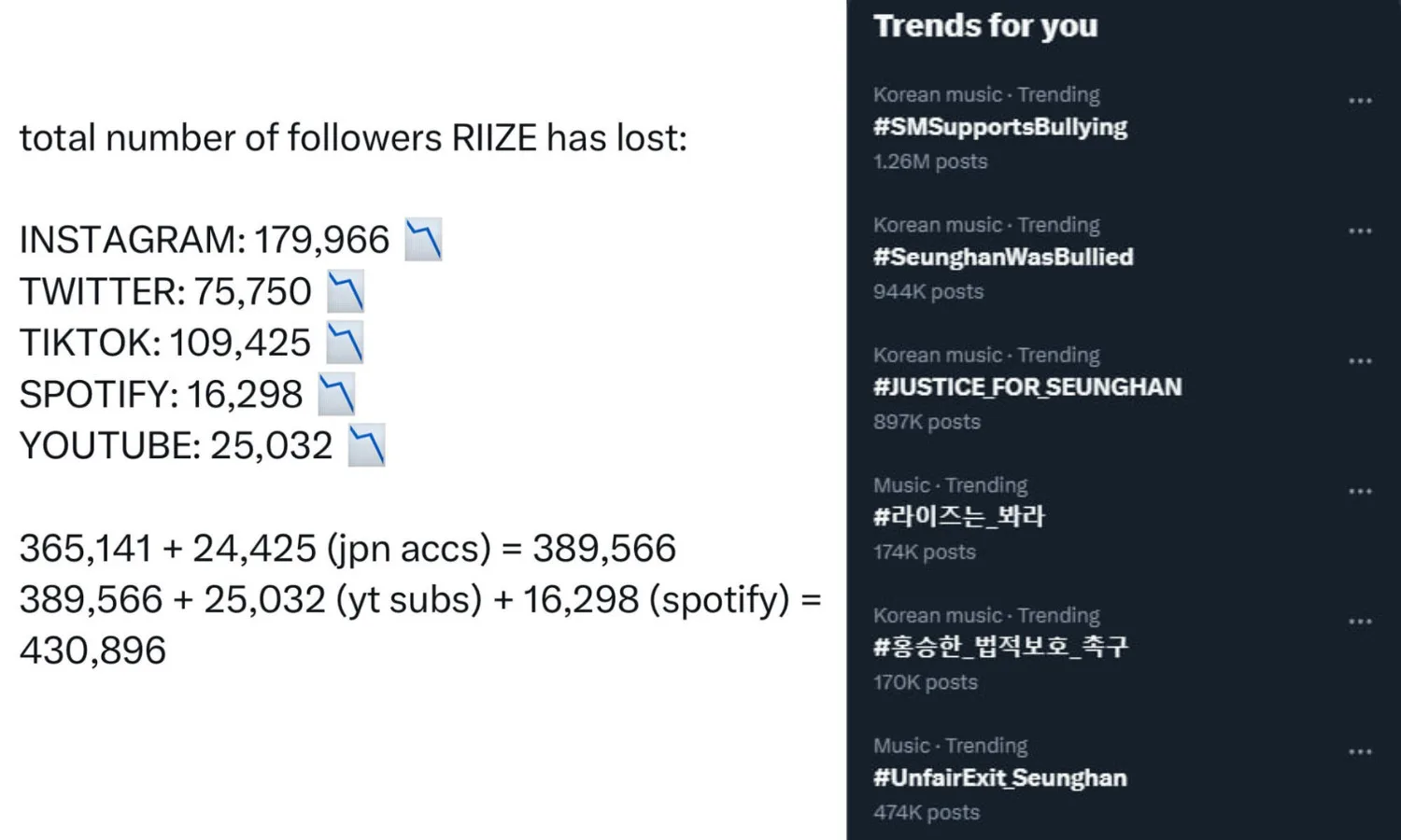The boycott seems to be going in favour of protesting fans, as results of unfollowing and blocking the boyband across multiple social media platforms emerge online, showing the slow downfall RIIZE. The group’s main social platform, Instagram, went from having 4.2 million followers to only 3.9 million as of Thursday (16th October). Following that, their Twitter account also lost a significant amount of followers, enough to do damage to the group’s online image. Not to mention the multiple trending hashtags, with up to 1 million posts showing support towards Seunghan.
