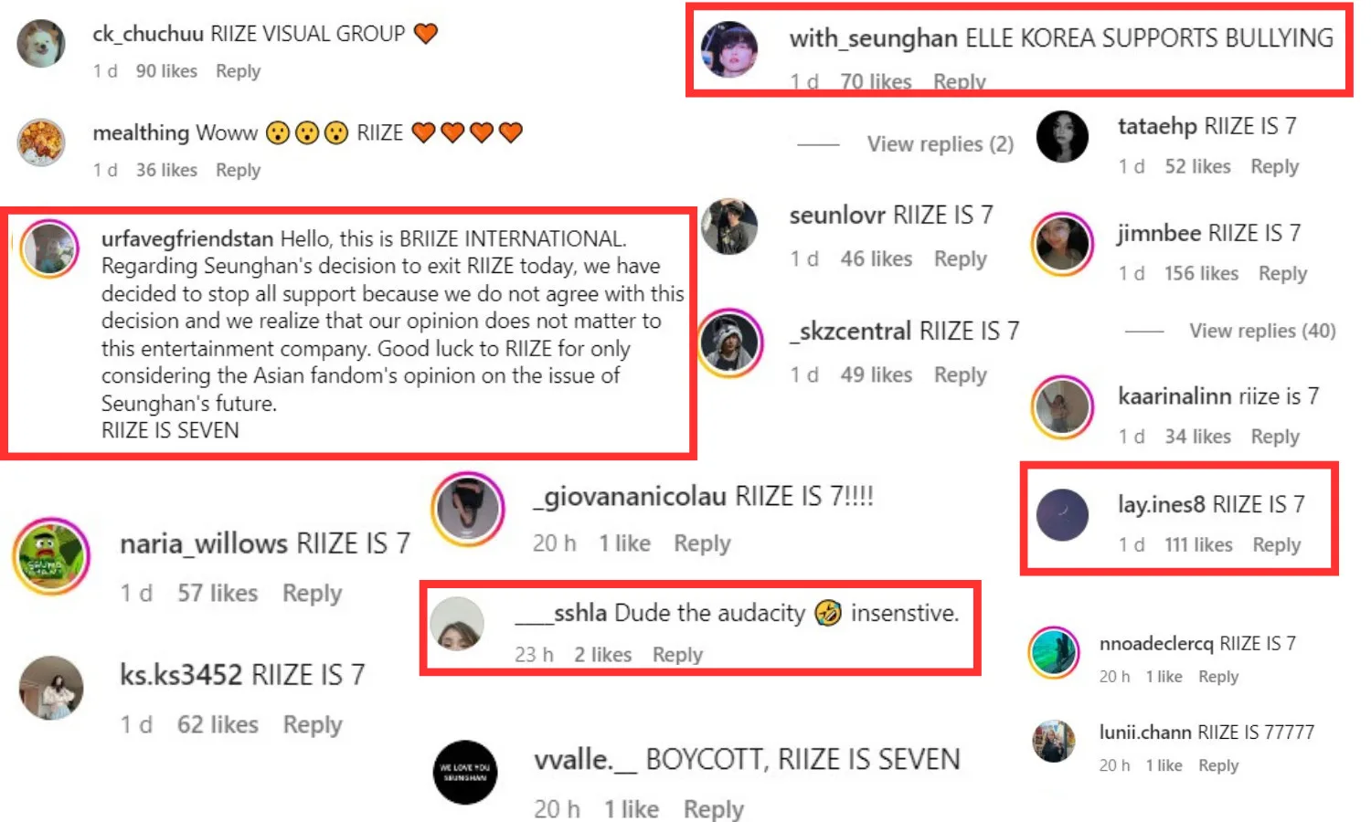 SM Entertainment’s investment stocks also suffered from loss throughout the duration of this dispute, with losses of up to 2.09% that happened in just a few hours. While all of this was ongoing, ELLE Korea posted a teaser picture of an upcoming magazine cover, which later was revealed to be RIIZE, except Seunghan was excluded. The decision to post this in the midst of everything has shone a negative light on the post, with fans deeming it as “insensitive”. Netizens shared their thoughts in the comment section of said post.