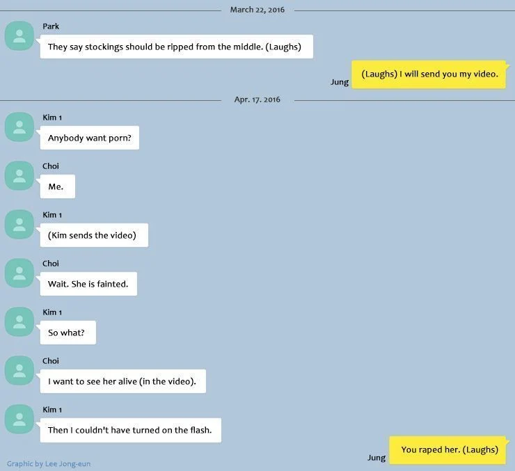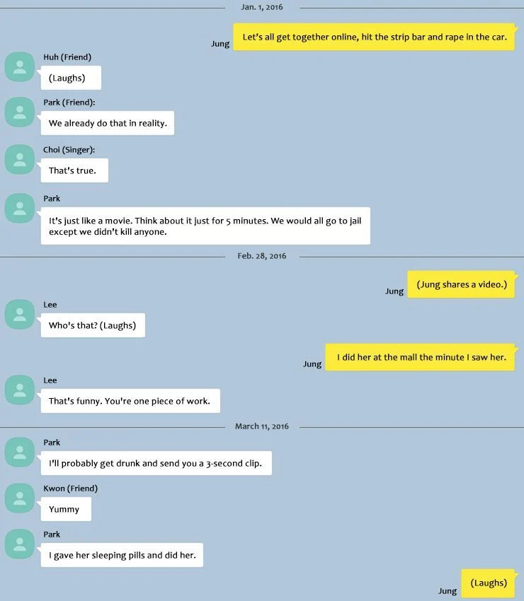 Evidence of their group messages KaKao Talk chats, where they talked about drugs, rape, and usage of hidden cameras to record sexual acts. SBS TV obtained the text messages (between December 2015 till April 2016) and provided the translated transcripts.